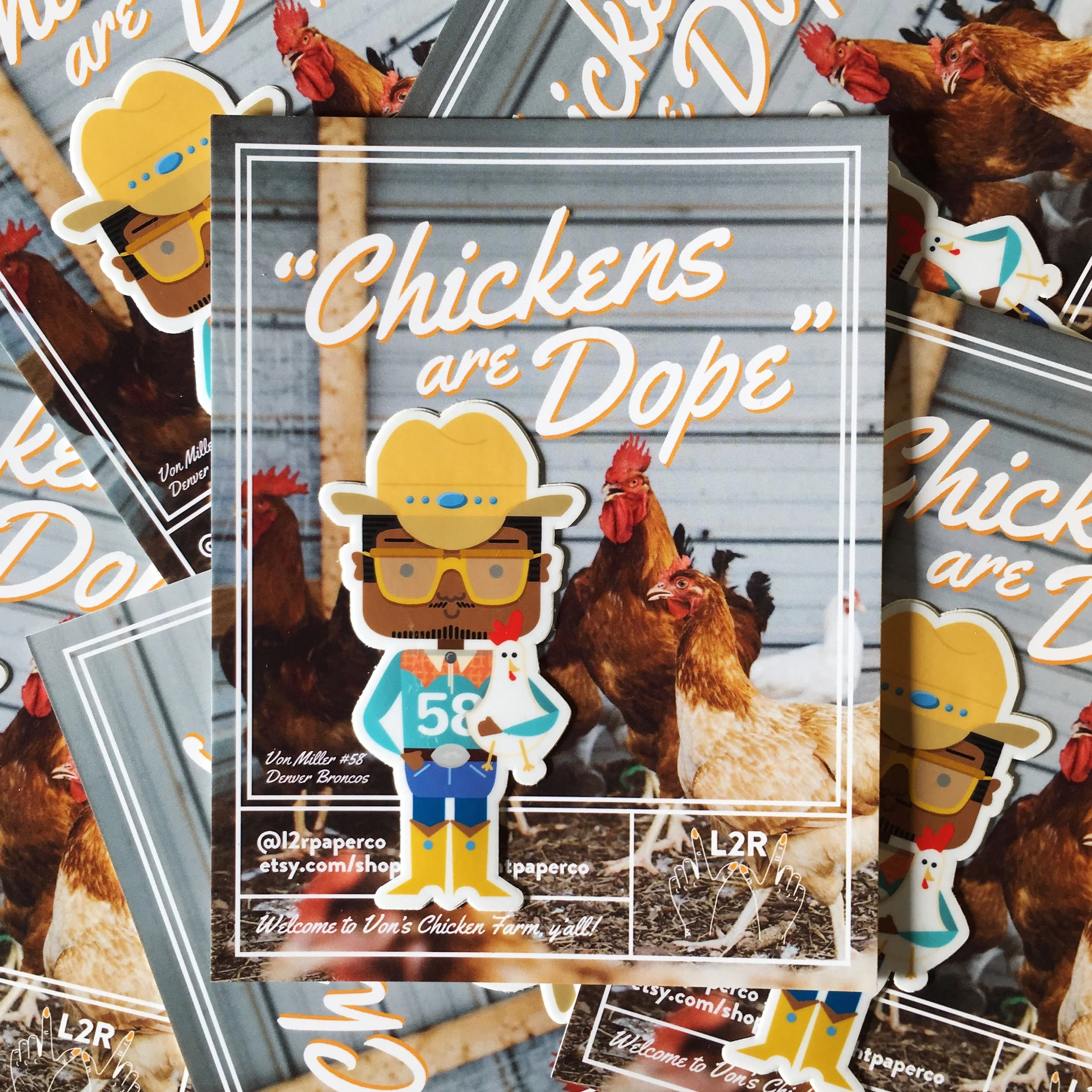 Left to Right Paper Company is a joint venture between me (the "left" side/left coast) and my friend Champa (the "right" side/right coast). We make stickers, cards, postcards, about generally nerdy subject matter, or whatever we're into (i.e. Super Bowl MVP Von Miller and his obsession with chickens.)